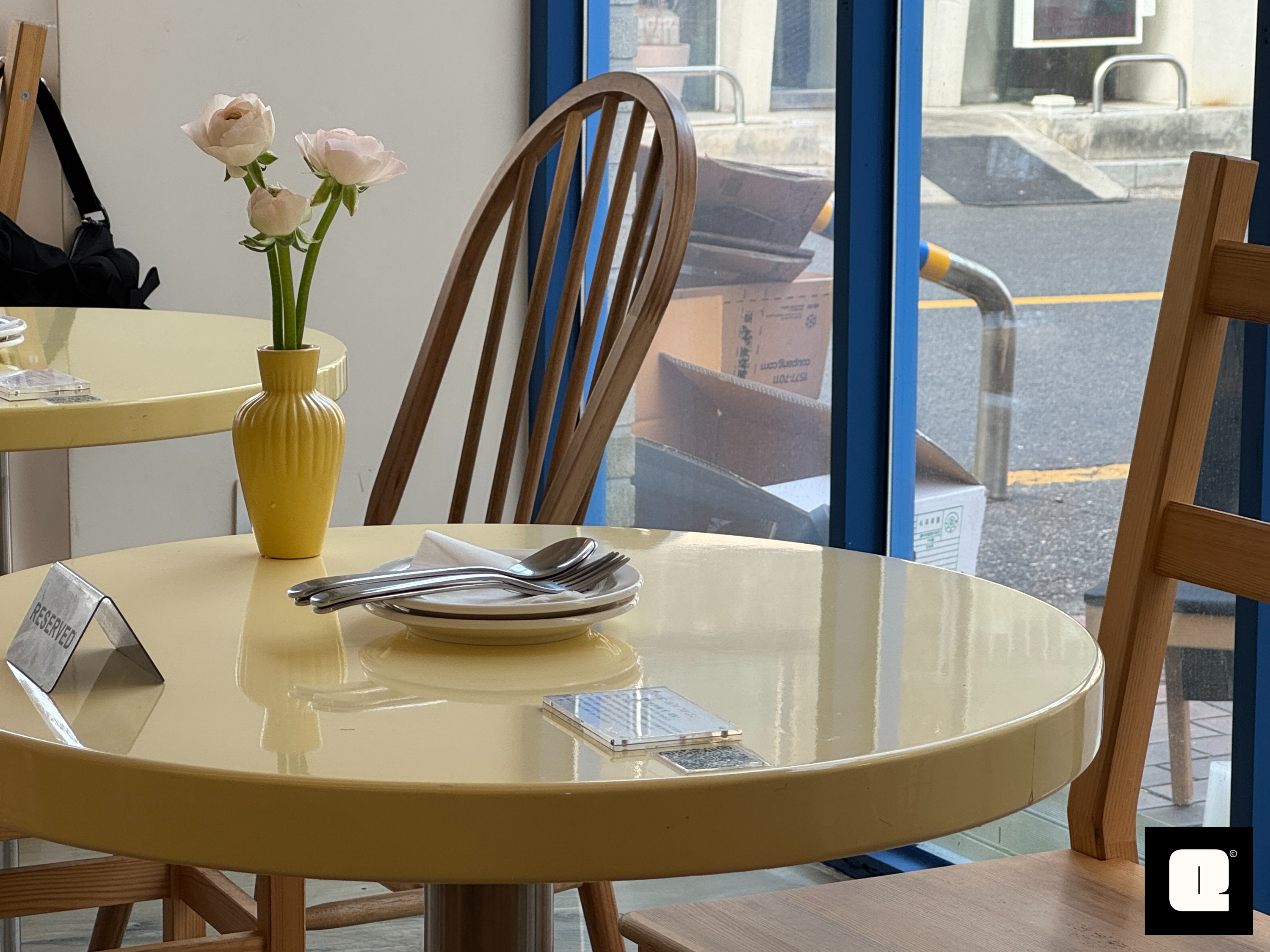 테라스 좌석은 노란 테이블로 꾸며져 있고, 바로 앞이 놀이터라 아이가 특히 좋아했다. 이날 날은 따뜻했지만, 미세먼지 최악이라 사람 하나 없는 놀이터에서 꿋꿋이 혼자 놀던 아이. 바로 우리 애야, 우리 애! 괜히 웃음이 났다.