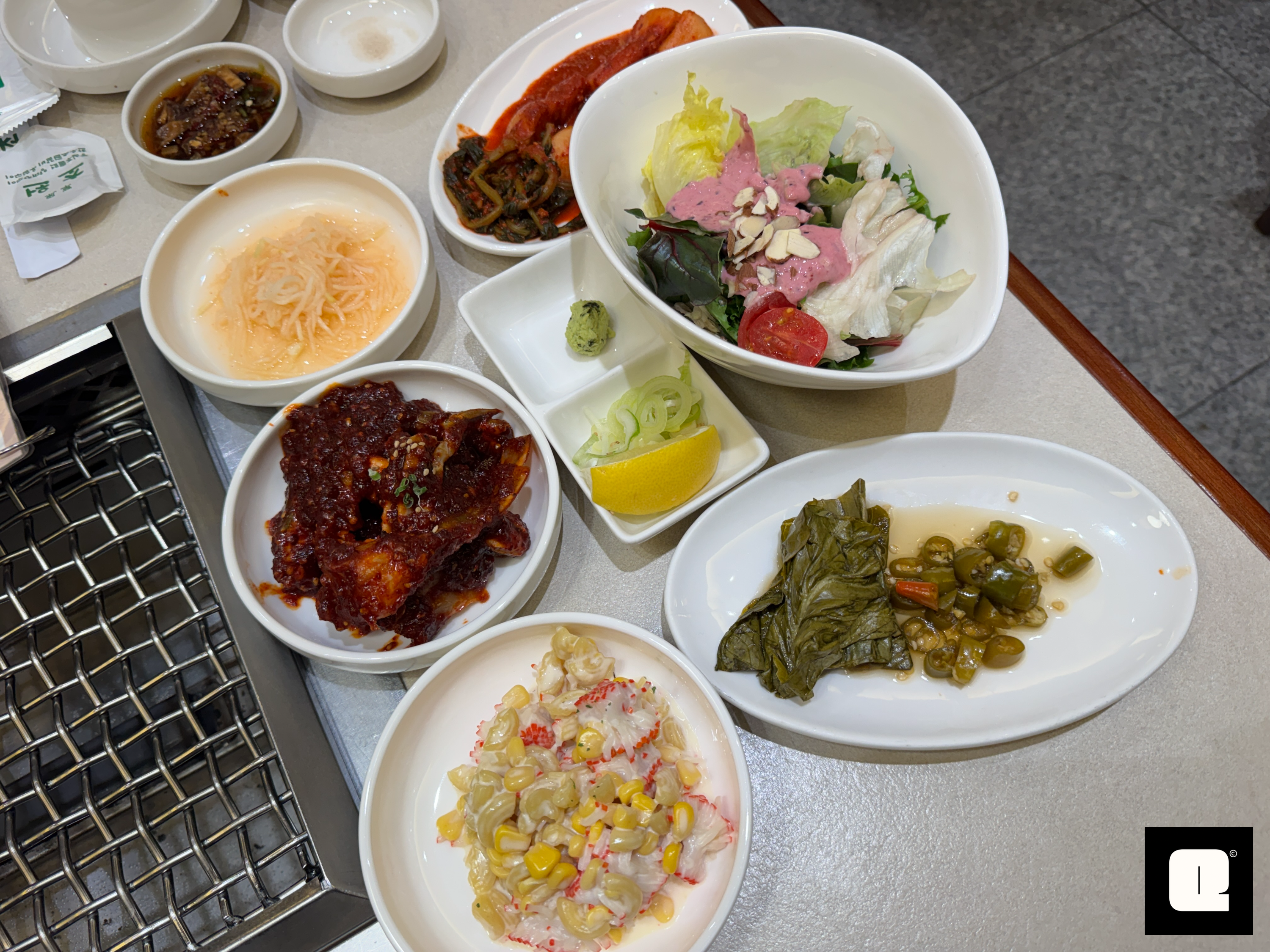 샐러드와 김치, 양념게장, 콘샐러드, 짱아찌 등 모두 입에 짝짝 붙는 구성으로,