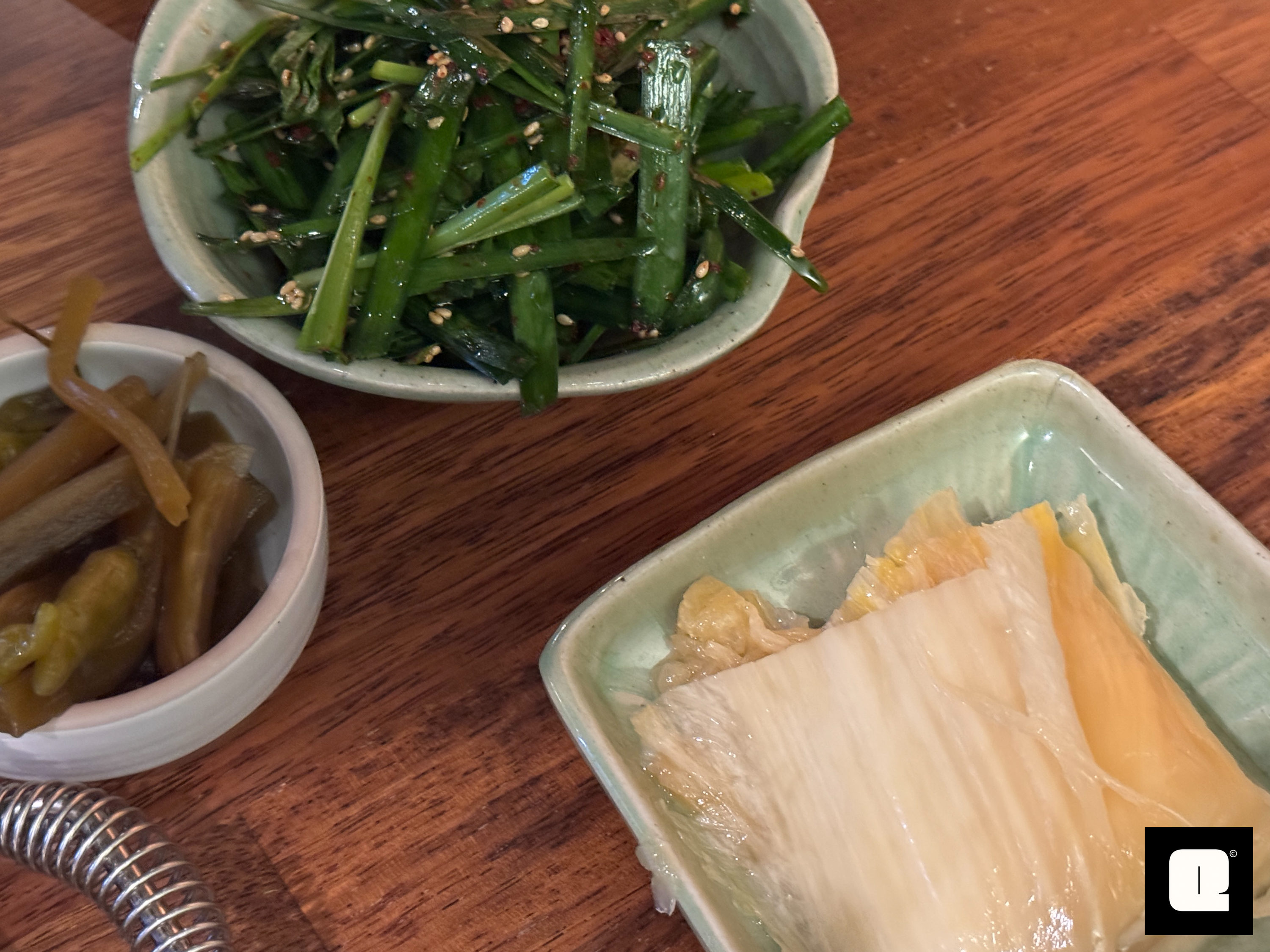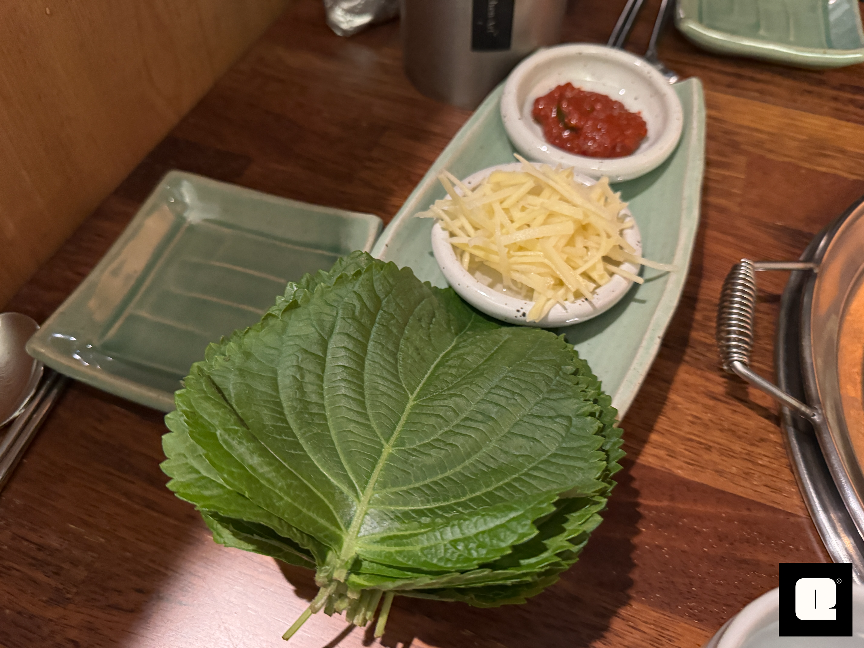 깻잎, 생강, 부추무침, 백김치가 미리 깔려 있다.