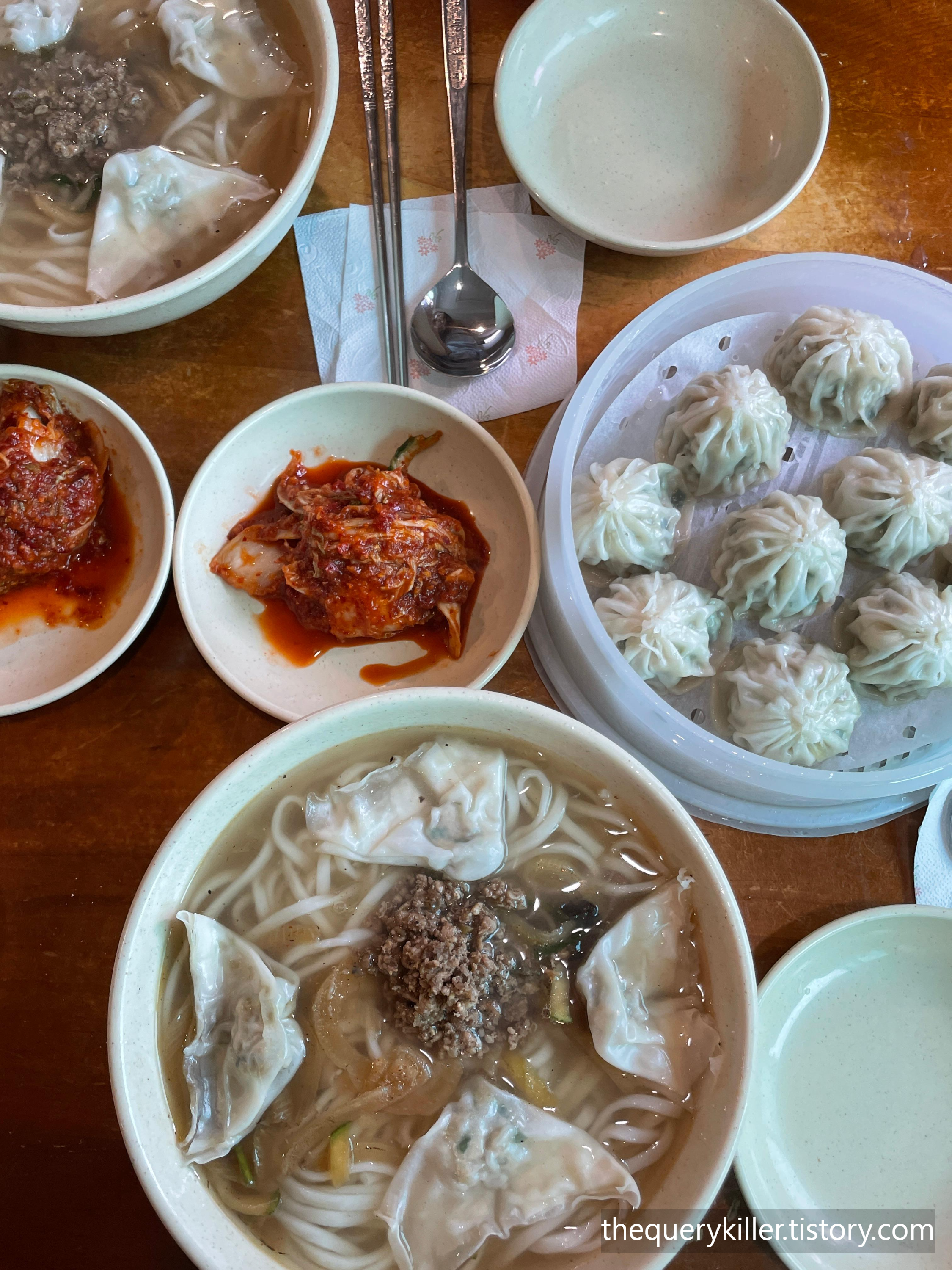 명동교자의 킥은 마늘범벅 김치!!!!!! 이 맛이 너무 그리운데 명동교자를 갈 수 없던 때에 인터넷에서 마늘 김치를 주문해 먹어봤지만 역시나 이 맛을 따라할 수는 없다. 그야말로 마늘로 이리 메치고 저리 메치고 아주 혼쭐이 나는 맛! 그렇기에 점심 이후 중요한 약속이나 미팅이 있는 날은 절대 먹어서는 안 되는 마성의 김치라 할 수 있다. 육즙이 가득한~ 한입에 쏘옥 들어가는 만두도 말이 필요 없는 맛. 속이 꽉 차 있으면서도 텁텁함 없이 깔끔하고, 칼국수 국물에 살짝 적셔 먹으면 궁합이 최고다. 늦게 나온 비빔국수는 먹기 바빠 사진에 담지 못했지만, 명동교자의 숨은 시그니처라고 생각하는 메뉴. 매콤달달한 양념이 계속 손을 가게 만든다. 칼국수, 만두, 비빔국수 루틴이면 만족감은 거의 120%(언제나 나의 먹부림은 무한 흡입 가능한 메뉴 구성에서 시작되는 듯...) #다이어트는다음생에...
