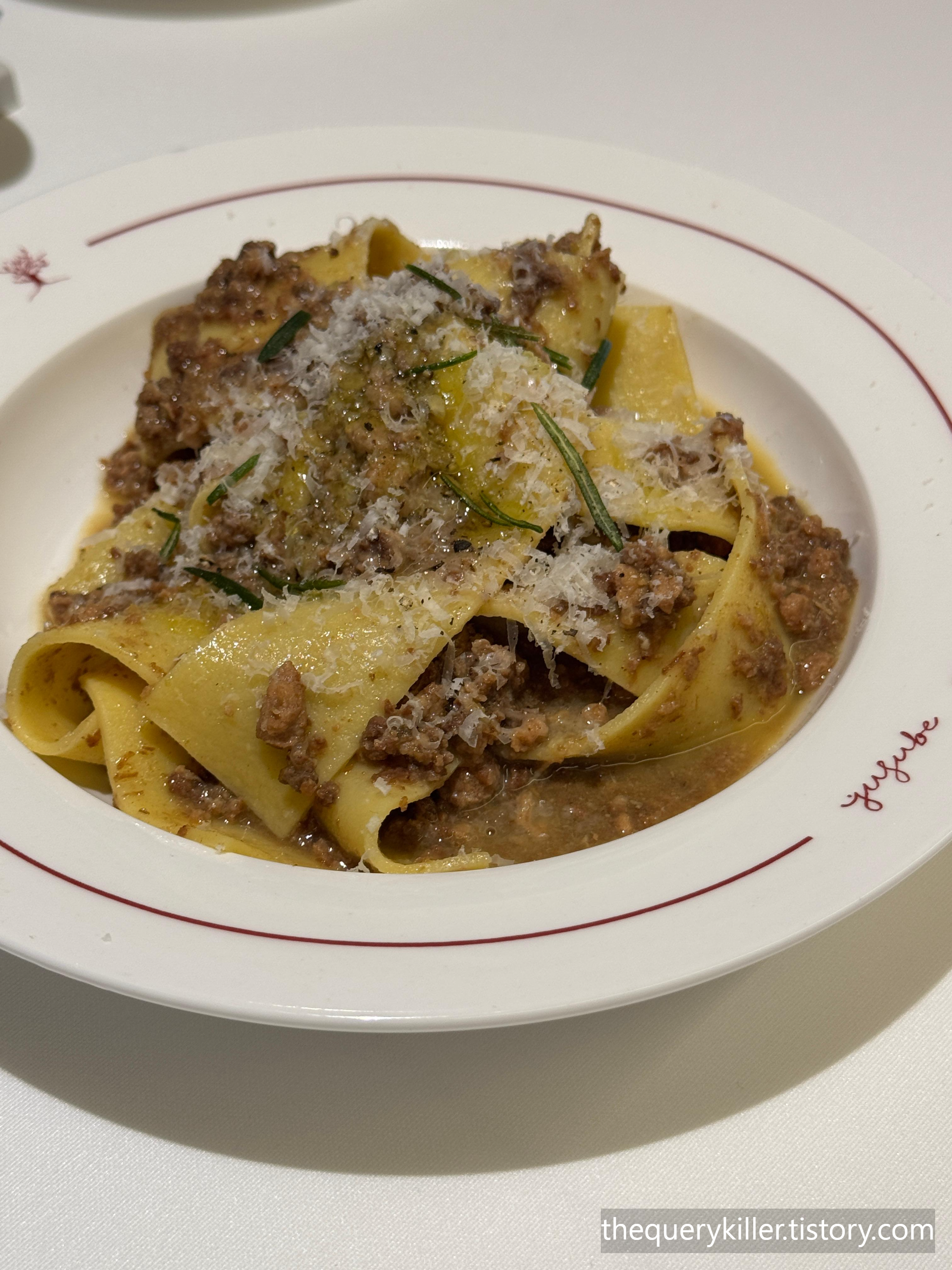 생면을 미리 고른 터라, 파스타에 대한 기대가 가장 컸다. 그중에서도 가장 맛있었던 건 라구. 넓은 파파르델레 위로 고기의 결이 살아 있는 라구 소스가 넉넉히 얹혀 나온다. 주쥬베식 라구는 다짐육을 잘게 부수지 않고 큼직한 결을 그대로 남겨 포크로 말아 올릴 때마다 육향이 톡 하고 퍼진다. 토마토 산미가 강하지 않고, 고기, 와인, 허브의 밸런스가 안정적이라 묵직함보다 고소하고 깊은 맛이 먼저 느껴진다.