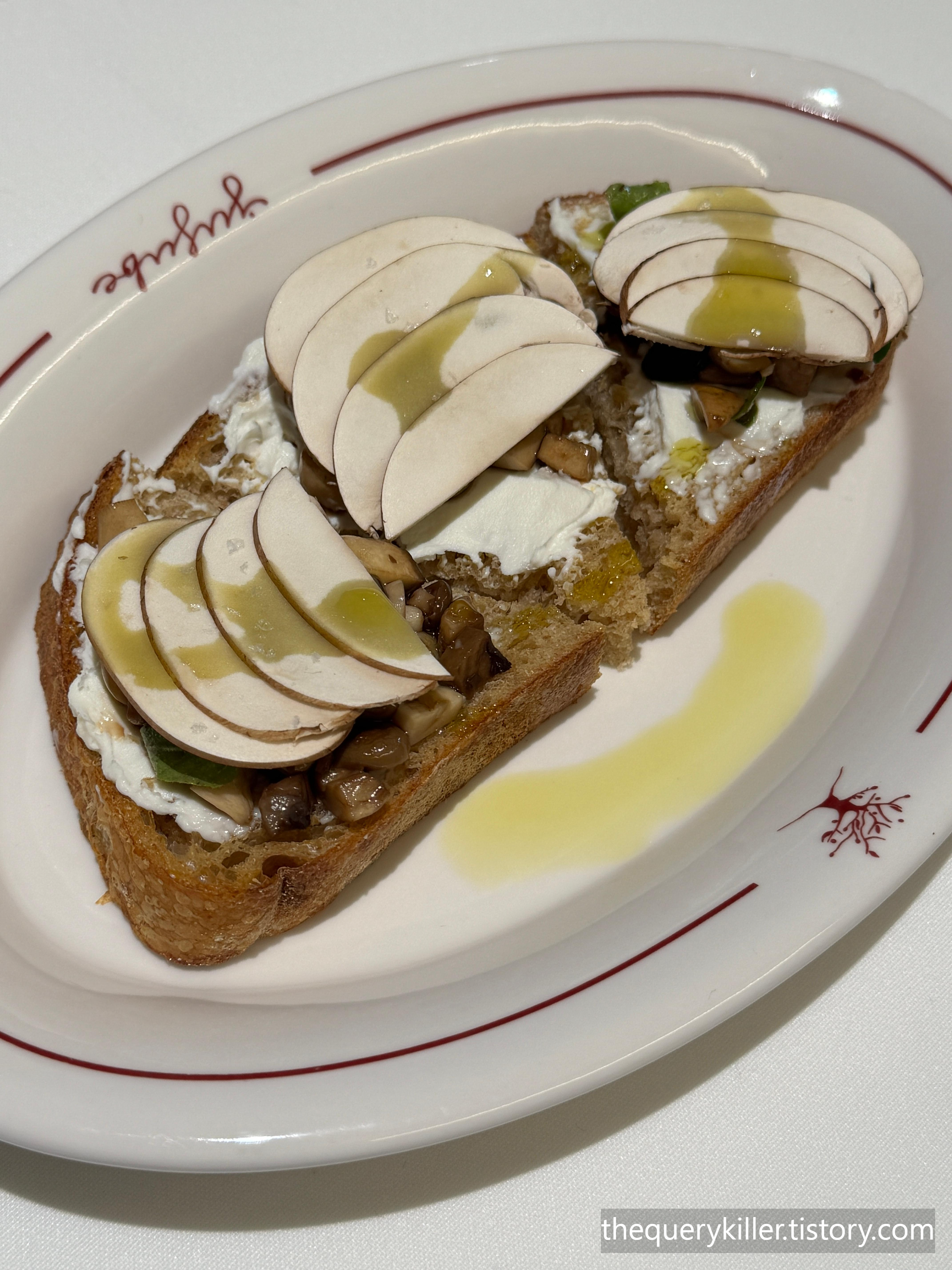 첫 접시는 사과와 리코타 브루스케타. 바삭하게 구운 빵 위에 얇게 슬라이스한 사과와 리코타가 층층이 포개져 있어 산미와 크리미함이 깔끔하게 균형을 잡는다. 시작부터 와인 한 잔을 자연스럽게 부르게 하는 맛. 주쥬베는 내추럴 와인과 이탈리아 와인을 고르게 갖추고 있는데, 이날 선택한 화이트는 산미가 과하지 않고 가벼워 우리가 주문한 요리들과 잘 어울렸다.