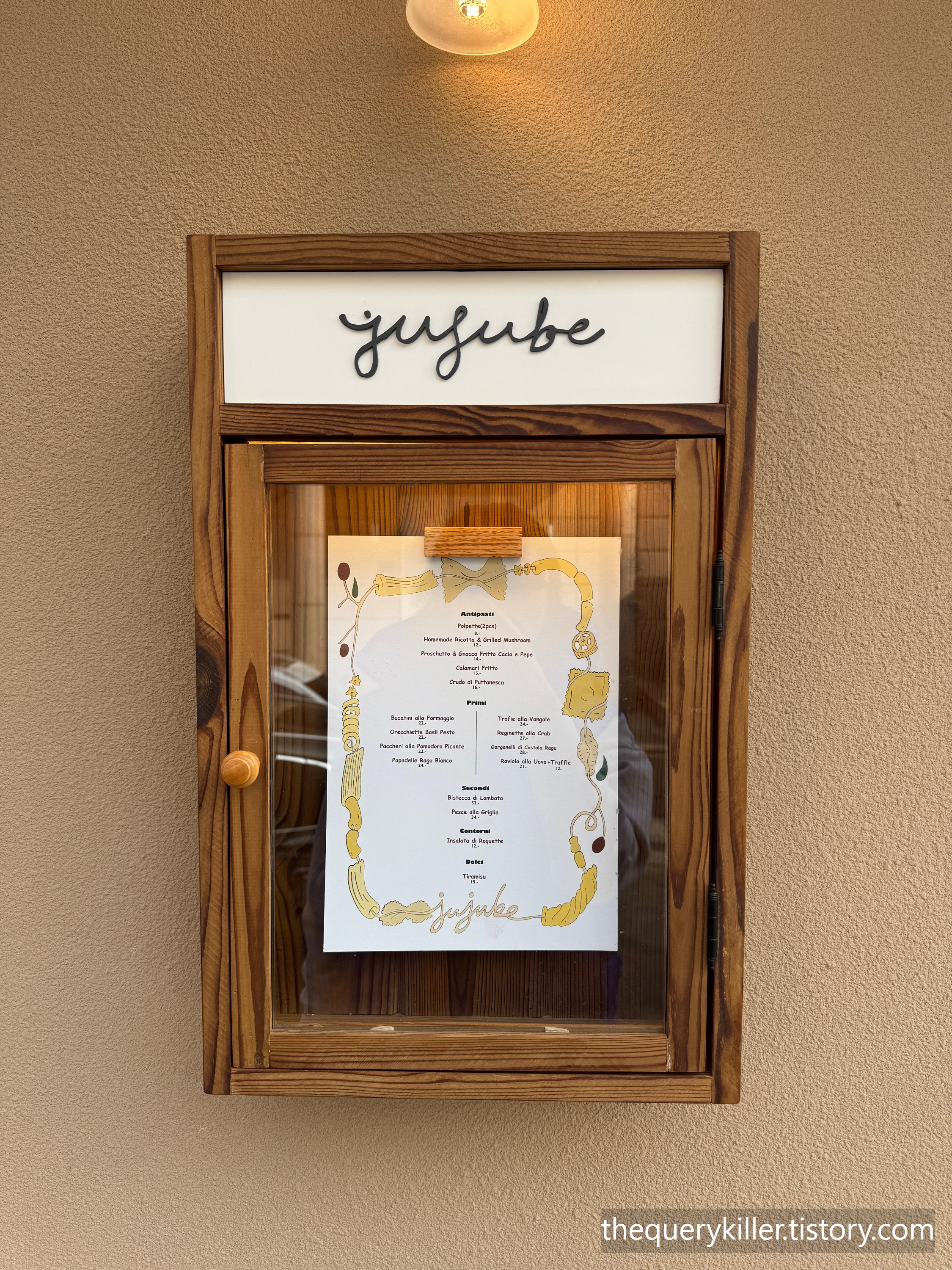 청담동 골목 한편, 조용한 간판을 따라 들어가면 이탈리아 가정식 냄새 같은 따뜻한 공기가 먼저 반긴다. 이름도 발음도 귀여운 주쥬베. 이곳의 식사는 생면 트레이를 직접 보여주는 순간부터 시작된다. 어떤 파스타를 먹을지 고르는 과정 자체가 하나의 경험처럼 느껴지고, 밀가루의 질감, 면의 두께, 건조된 결을 눈으로 확인하니 요리의 맛보다 먼저 식감이 상상되는 재미가 있다. 공간은 화려하지 않고 단정한 분위기이고, 테이블웨어도 이 집의 미니멀한 개성이 잘 녹아 있다.