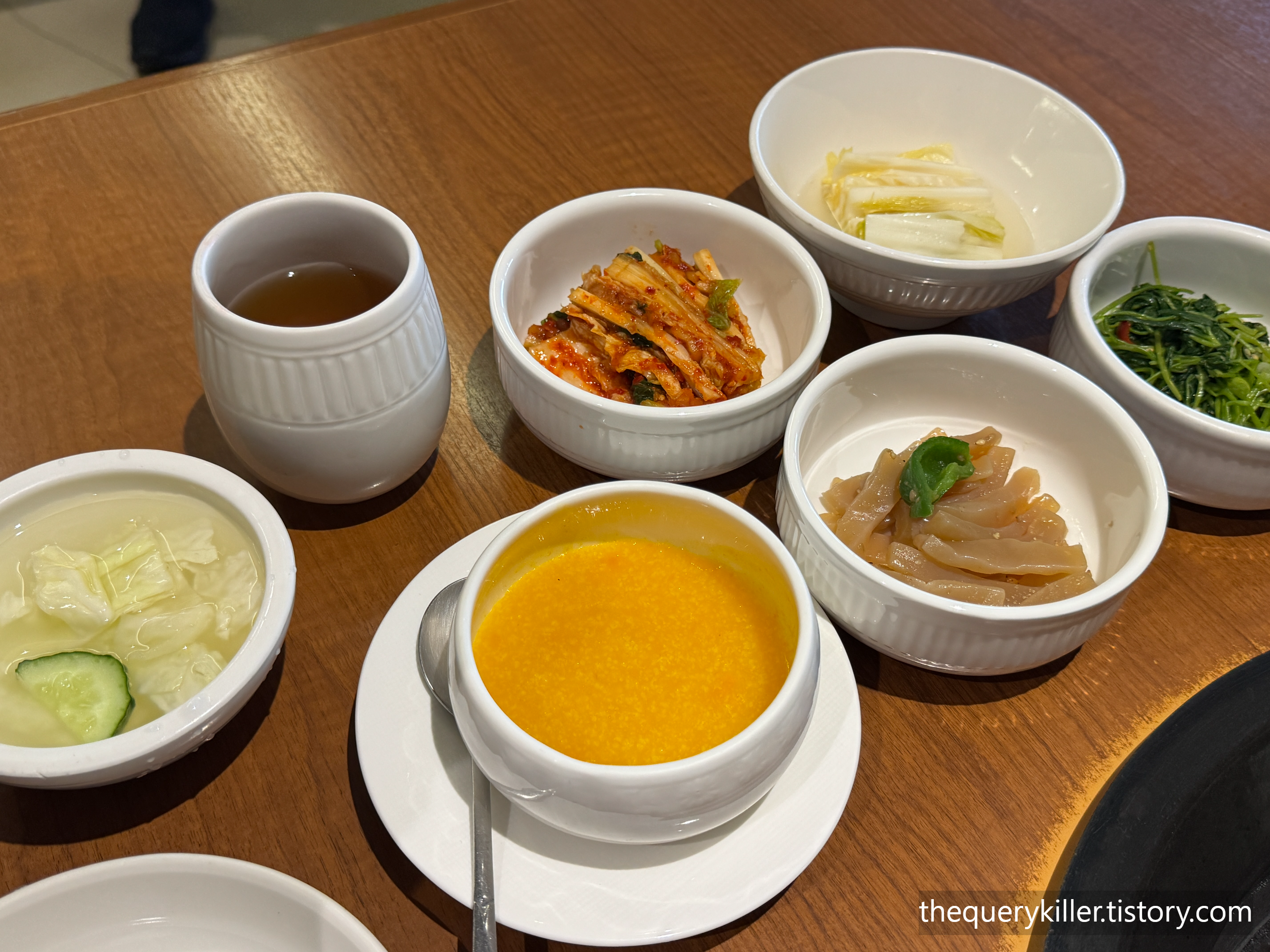 평소엔 로스 편채 세트를 많이 먹는데 이날은 다들 고기 느낌이 아니라고 해서 버섯국수전골로 결정. 반찬이 먼저 분위기를 잡는다. 하나씩 맛보면 어느새 접시가 비어 있고, 결국 리필까지 가게 되는 구조. 호박죽은 부드럽게 씹히는 입자감이 매력이고, 시원한 동치미는 첫입부터 기분을 확 살린다.
