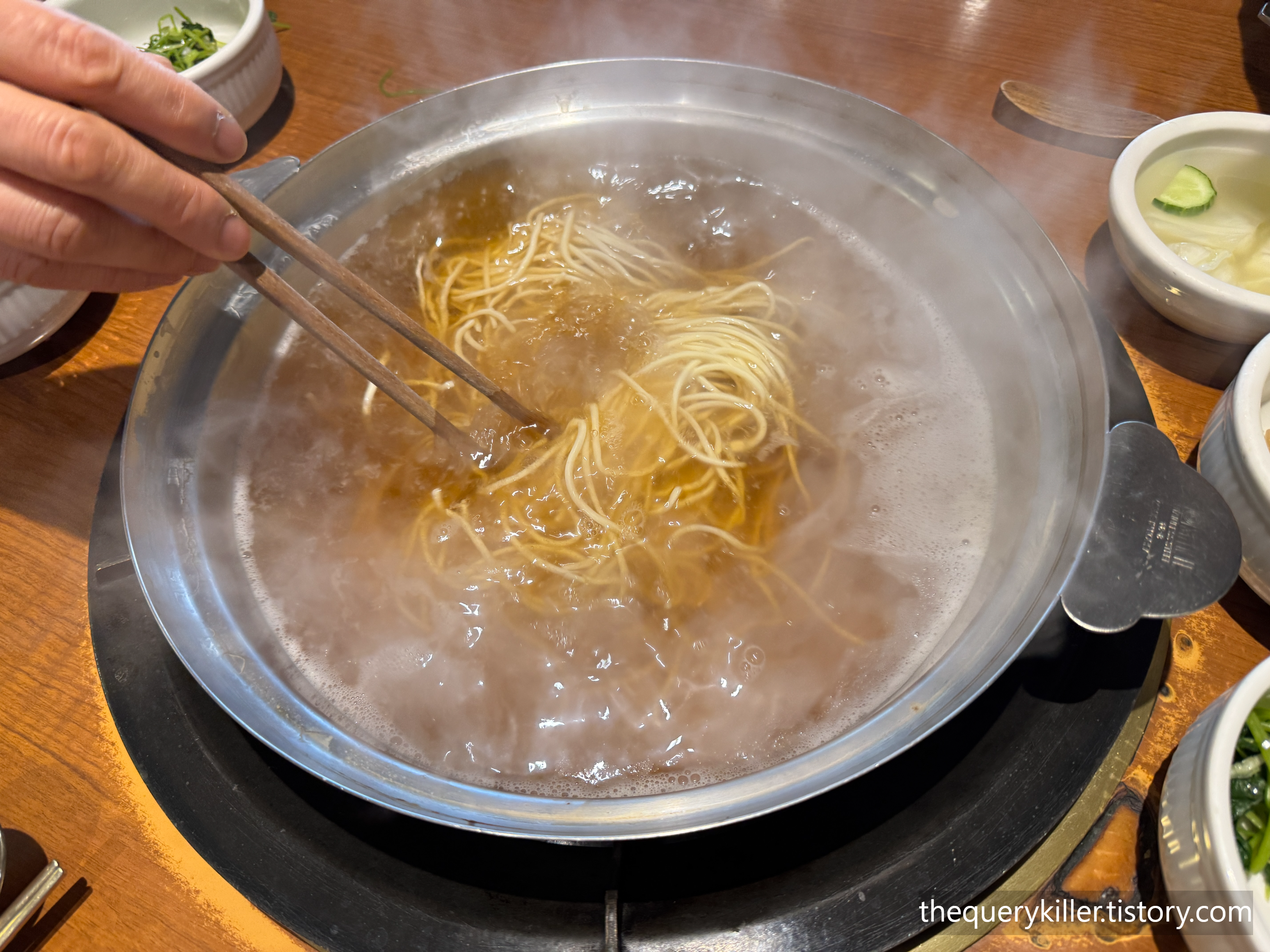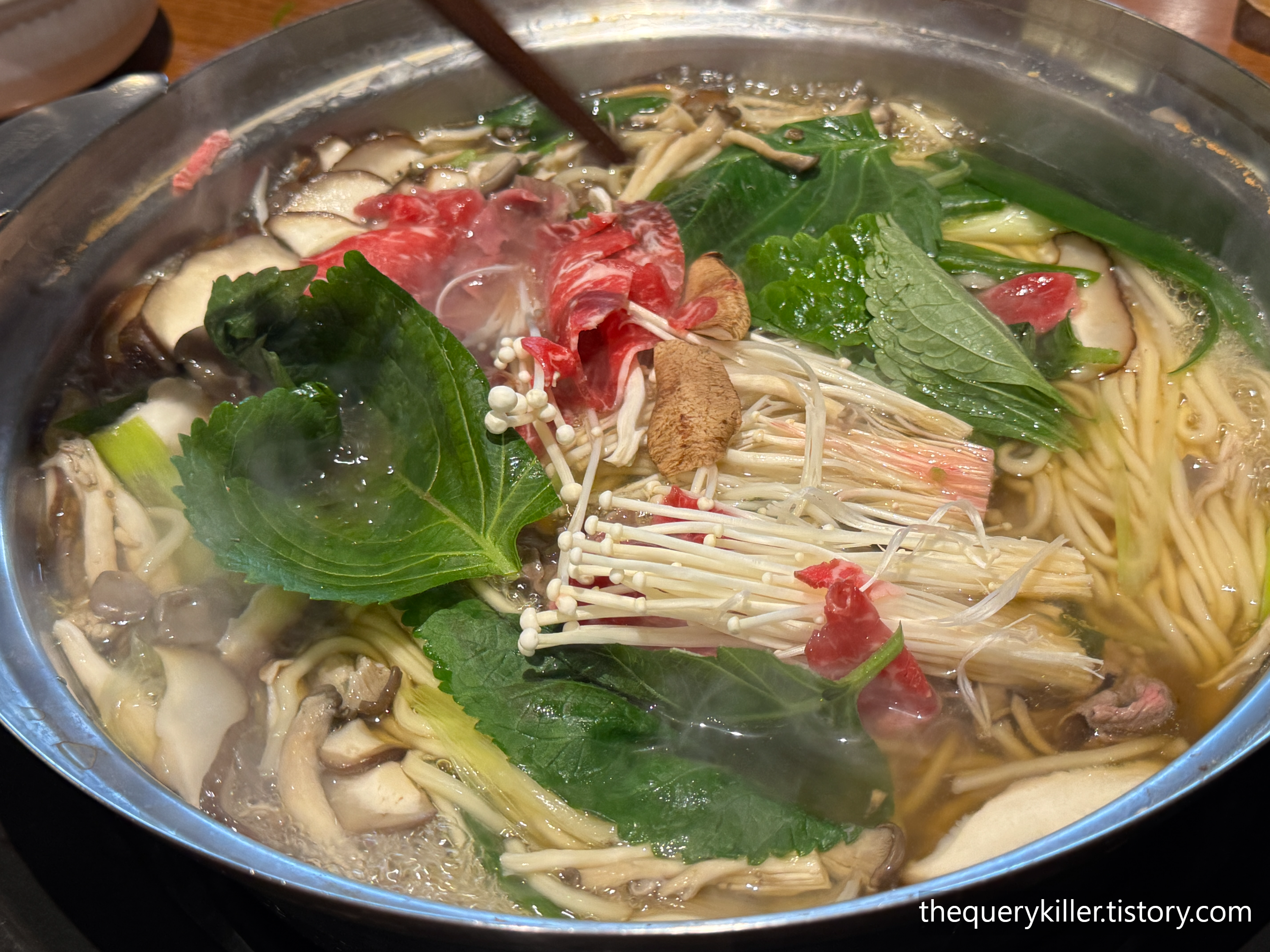 전골은 국수–채소–고기 순서로 들어가면서 보글보글 올라오는 향부터 다르다. 고기 육수 특유의 깊고 고소한 향이 먼저 올라오고, 그 사이로 버섯 향이 은근하게 퍼지면서 이미 숟가락을 들 준비가 된다. 서버가 옆에서 끓는 상태를 계속 챙겨주다가 딱 좋을 때 그릇에 나눠 담아주는데, 이때 국물을 떠보면 감칠맛이 진짜 꽉 차 있다. 버섯은 종류마다 씹는 맛이 다르게 살아 있어 골라 먹는 재미가 있다. 어떤 건 촉촉하고 부드럽고, 어떤 건 탱글하게 씹히면서 육수 맛을 머금어 한입에 풍미가 확 퍼진다. 채소는 신선해서 숨이 살짝 죽었을 때 적당히 달큰함이 올라오고, 고기는 부드러워서 국물과 함께 넘어가는 느낌이 편안하다. 국수는 면발이 탄탄하게 삶아져서 포크로 들어 올릴 때부터 식감이 느껴진다. 후루룩 먹는 순간 뜨끈한 육수와 면이 한 번에 들어오면서 속이 확 풀리는 기분. 한두 젓가락만 해도 묵직하게 채워지는 만족감이 있다.