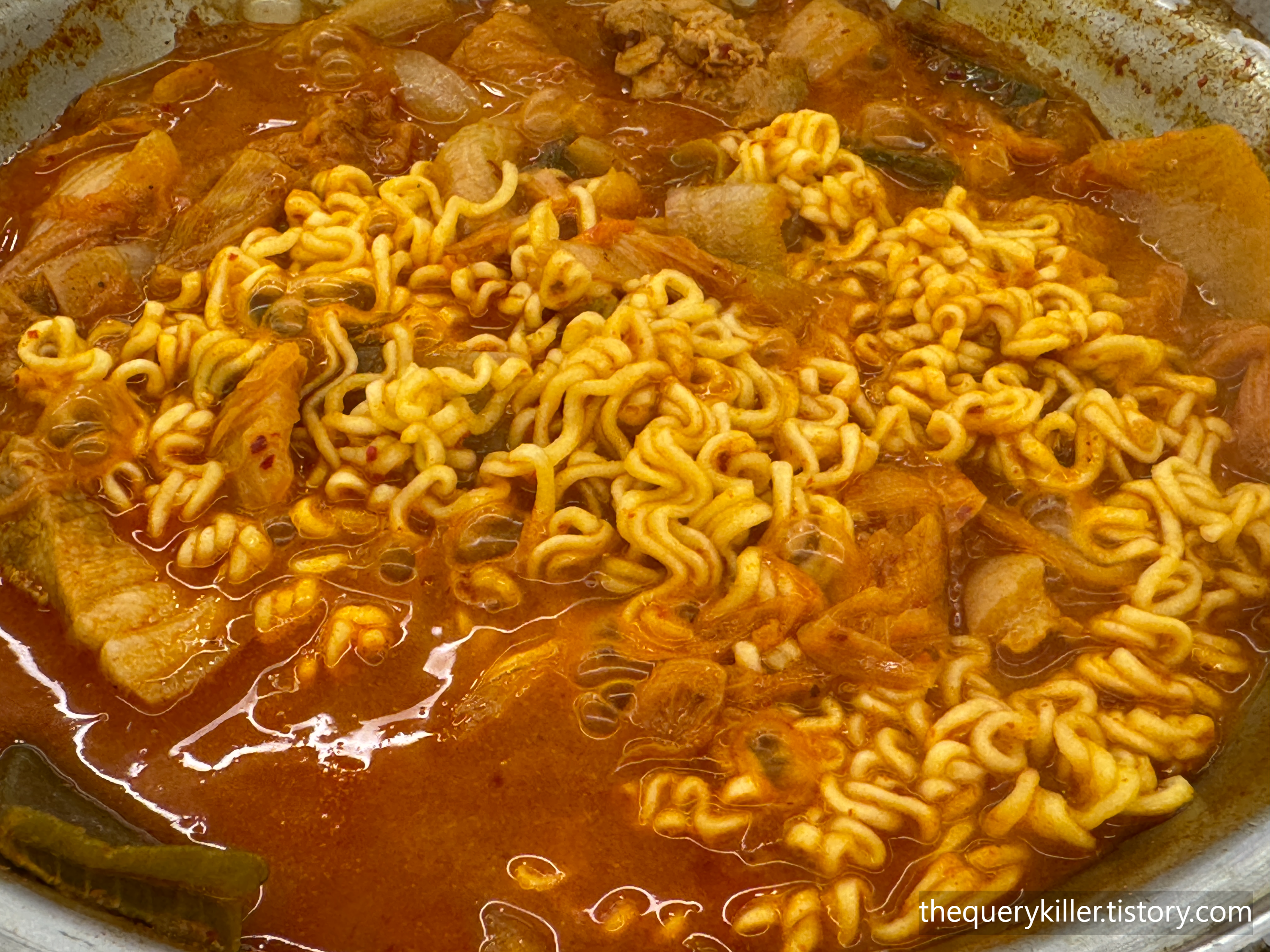 여기에 빠질 수 없는 라면 사리. 김치찌개 먹을 때 라면 사리를 안 넣으면 뭔가 빠진 느낌이라, 자연스럽게 추가. 어느 정도 국물이 졸아들었을 때 라면을 투하하면 김치와 돼지고기 맛이 면발에 쏙 배어들어 그냥 라면과는 다른 만족감을 준다. 꼬들하게 익혀서 먹어도 좋고, 살짝 퍼질 때까지 두었다가 국물과 함께 말아먹듯 먹어도 꽤 중독적이다.