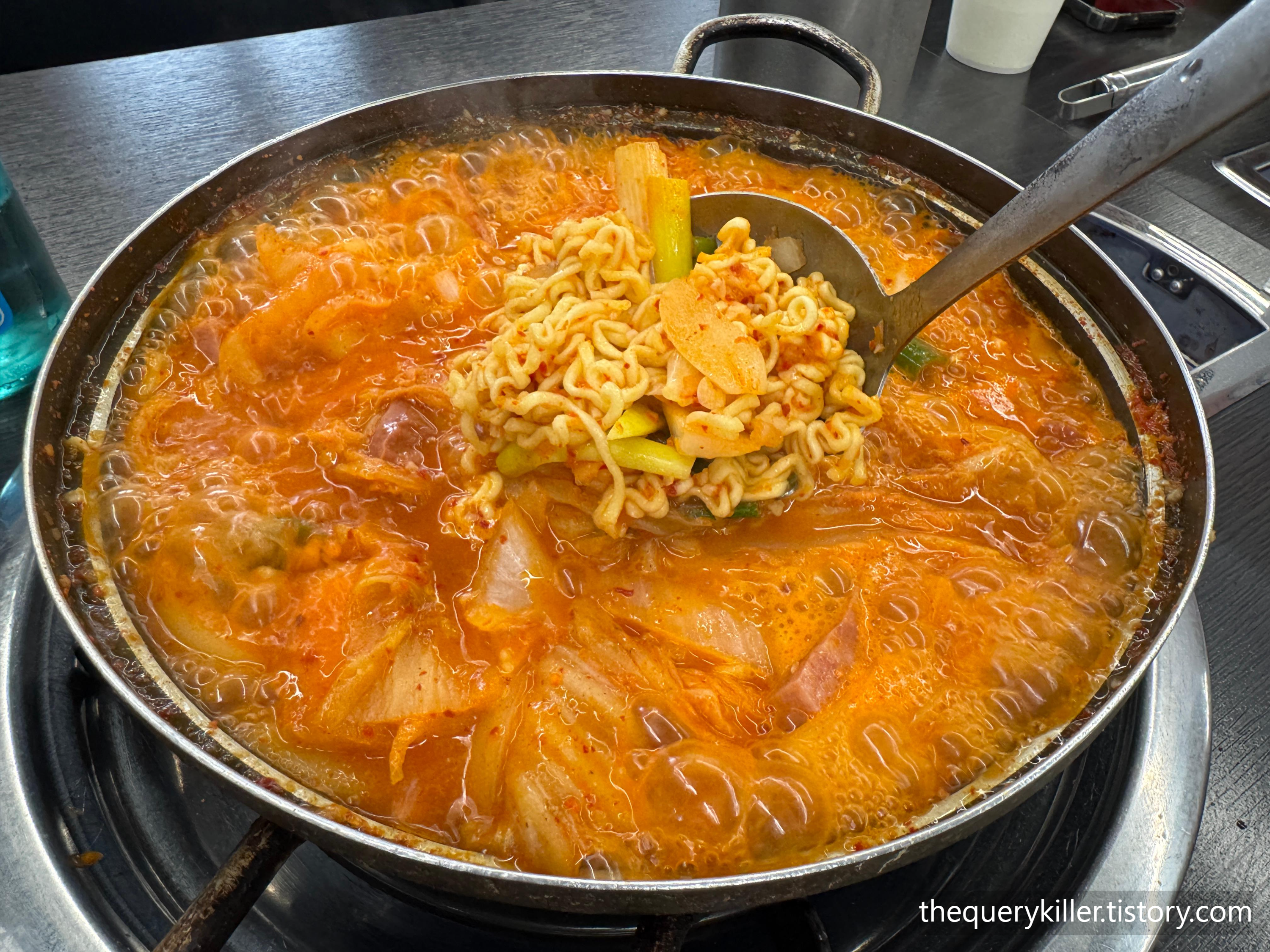 자리에 앉자마자 부대찌개 2인분과 계란말이를 주문했다. 하지만 점심 피크시간이라 계란말이는 불가하다는 답변. 아쉬웠지만 이 집의 본체는 결국 부대찌개니 찌개에 집중하기로 한다. 냄비가 끓기 시작하면 특유의 칼칼한 향이 먼저 올라온다. 프랭크 소시지, 길쭉한 햄 등이 고루 들어 있어 ‘부대찌개의 정석’을 충실하게 지킨 구성. 김치는 적당히 익어 씹을 때마다 매콤함과 감칠맛이 동시에 올라오고, 국물은 기대보다 더 진득하다. 숟가락을 쉬지 않고 계속 움직이게 만드는 맛.