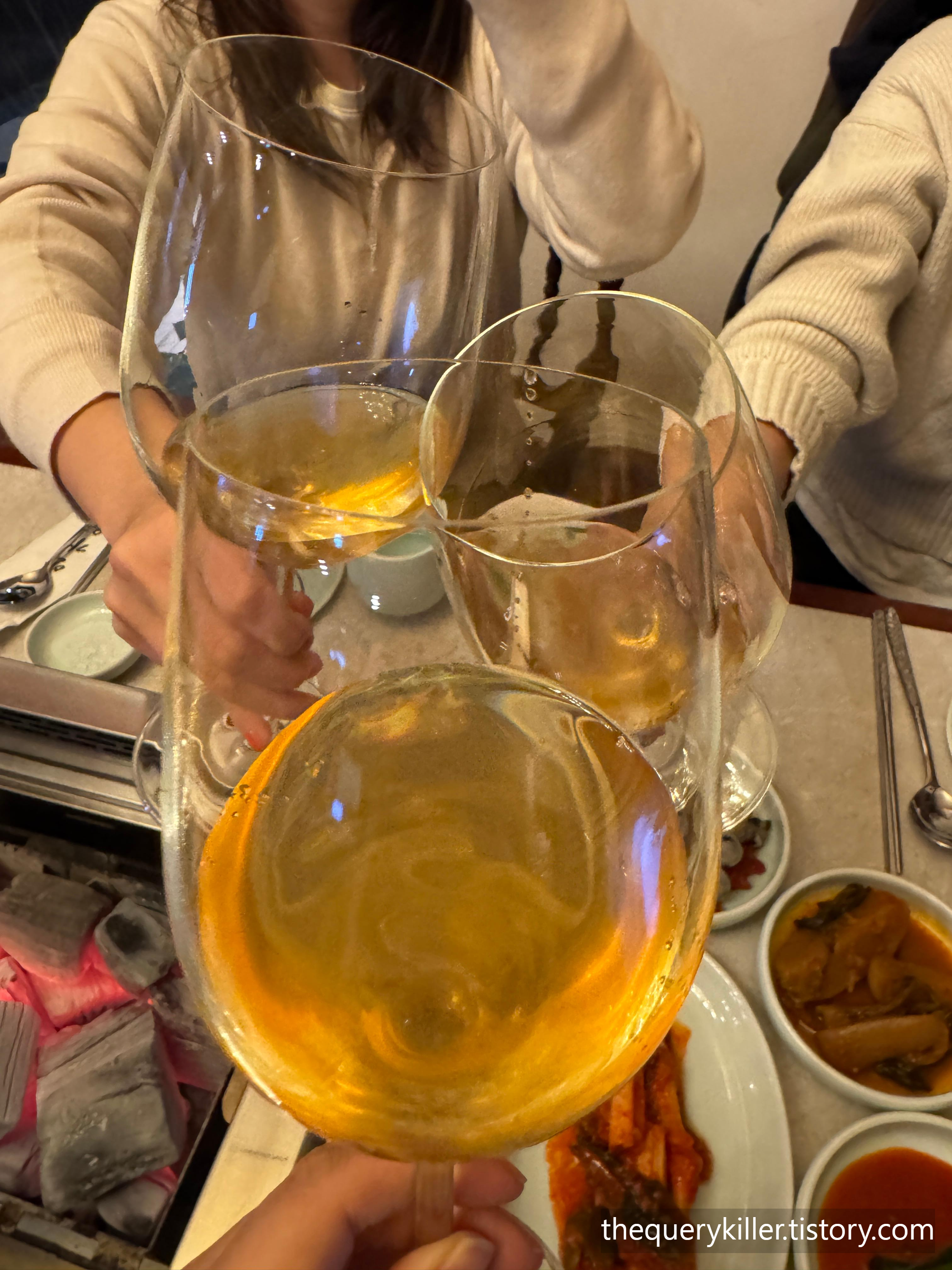 이날 일행이 돼지갈비와 어울리는 레드와인을 가져오기로 했는데, 깜빡하고 내추럴 와인을 가져오는 해프닝까지. 결국 고기 나오기 전 식전주처럼 한 잔씩 촙촙. 생각보다 고소한 밑반찬과 의외로 잘 어울렸다.