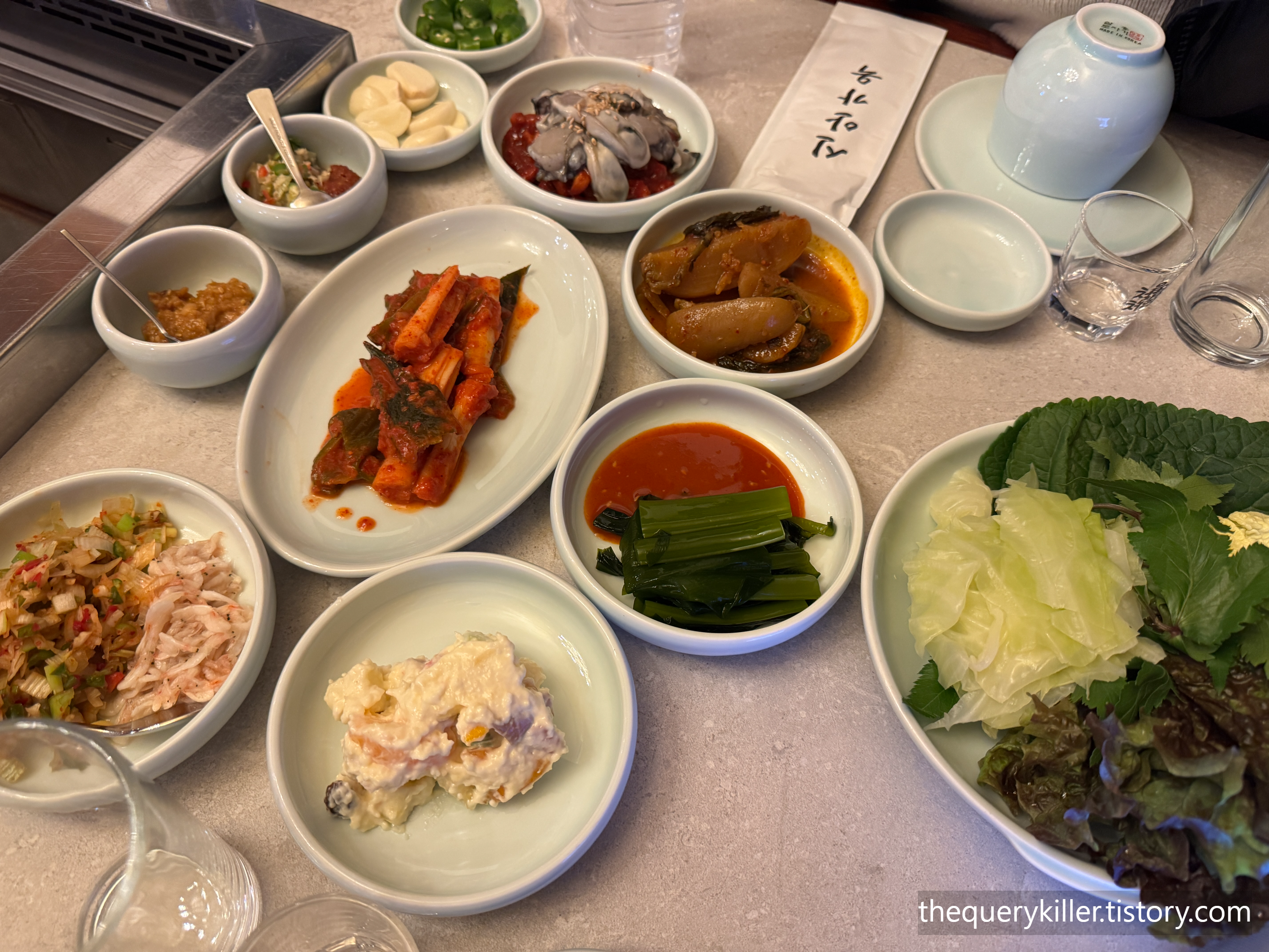 가장 먼저 주문한 건 이 집에서 꼭 먹어보라고 추천받은 생돼지갈비. 고기를 기다리며 밑반찬부터 구경했는데, 기본 찬으로 굴보쌈이 나온다니! 요즘 굴이 제철이라 그런지 통통하고 고소하다. 함께 나온 묵은지 김치는 적당히 삭아 감칠맛이 좋고, 쌈 채소도 신선해 시작부터도 설레는 상차림.
