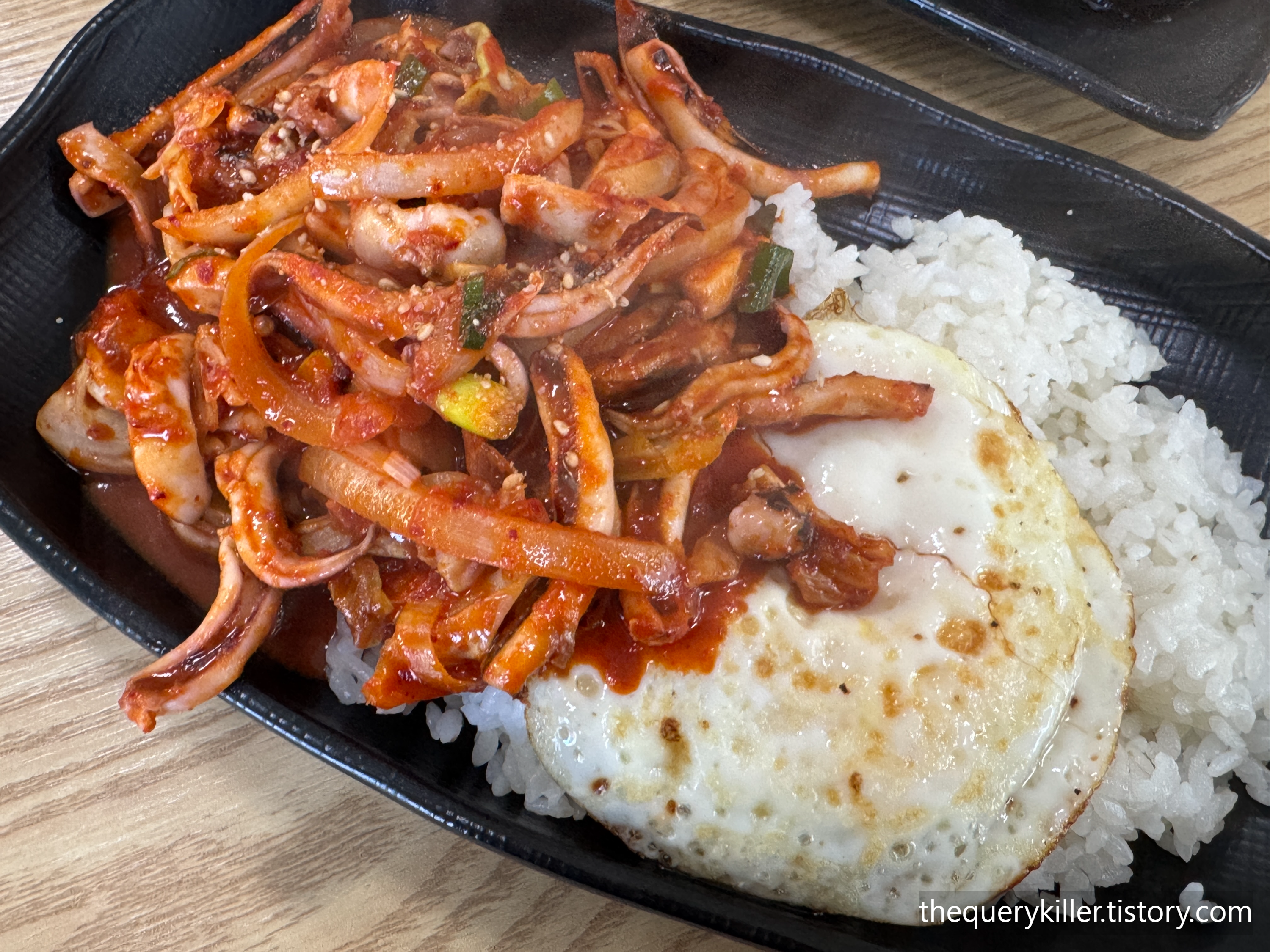 매콤한 양념에 볶아낸 오징어와 양파, 그리고 계란후라이가 올라간 구성(계란후라이가 킥!).