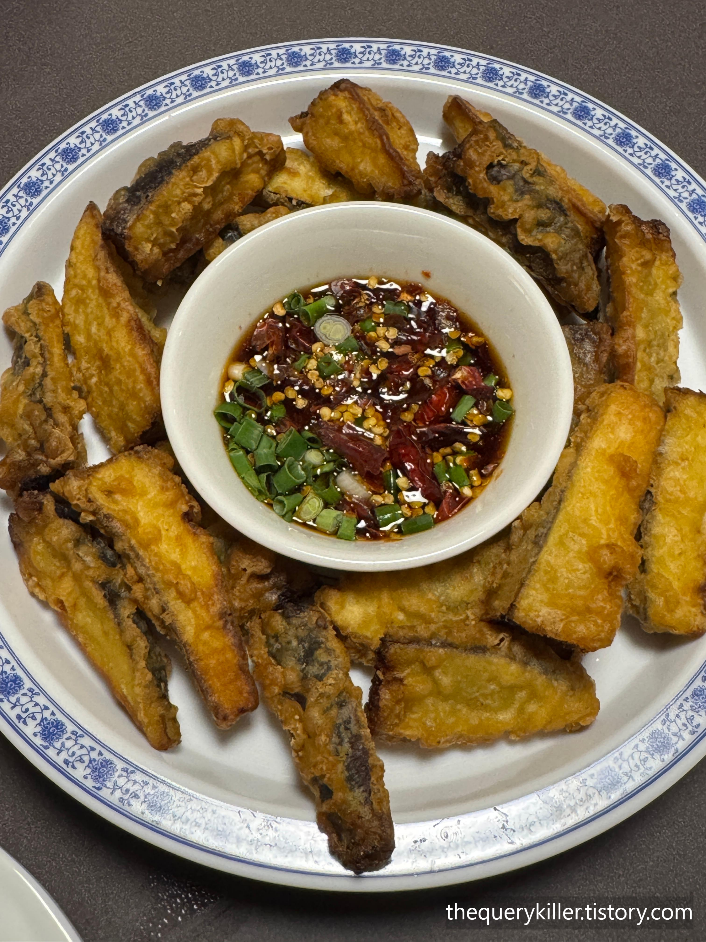 가지 튀김은 겉이 바삭하지만 기름이 조금 남아 있어 전체가 가볍지만은 않은 느낌이었다.